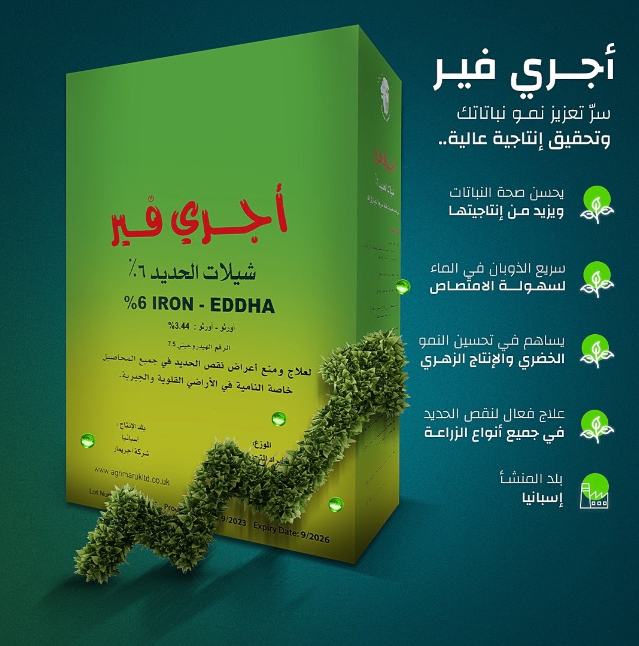 منتج متخصص لعلاج ومنع أعراض نقص الحديد في جميع المحاصيل الزراعية، يحتوي على حديد بنسبة 6% بصيغة EDDHA (أورثو – أورثو 3.44%) لضمان الامتصاص السريع والثبات في التربة القلوية والجيرية.